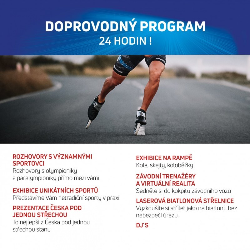 V doprovodném programu určeném pro všechny nechyběly ani informace o třídění elektra, zájemci si vyzkoušeli biatlonovou střelnici, profesionální trenažér závodního vozu, virtuální realitu, soutěže o super ceny, trenažéry veslování, handbike a další. Průběžně jsme poslouchali rozhovory s paralympioniky, kteří se účastnili her v Korei 2018 a 100 let Republiky jsme oslavili prezentací toho nejlepšího z Česka formou půl kilometrové dráhy s výjevy nejkrásnějších a nejzajímavějších míst v ČR.