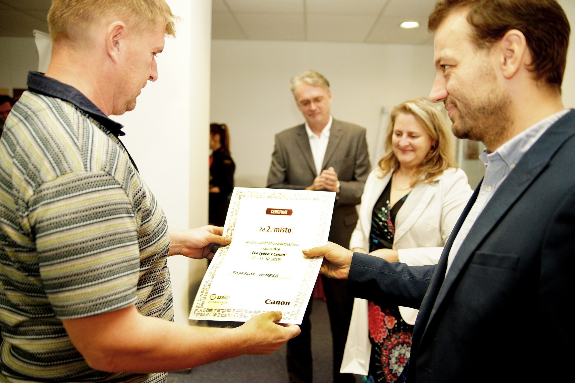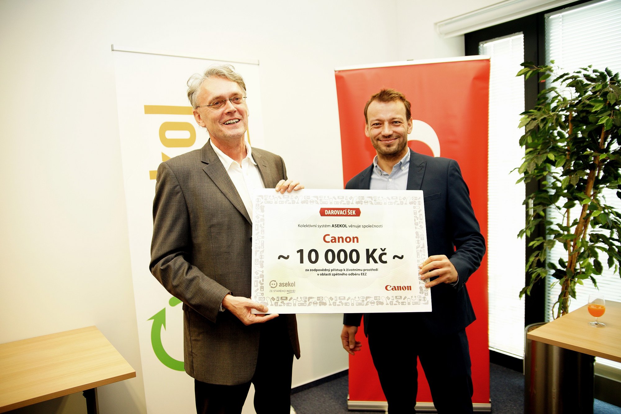 Společnosti Canon CZ byl také předán šek na 10.000,- Kč za zodpovědný přístup k životnímu prostředí v oblasti zpětného odběru EEZ. Částka bude použita na zlepšení systému odběru a zvýšení povědomí zákazníků o správné likvidaci a recyklaci použitých tonerů a cartridgí a naplnění recyklačních cílů v rámci cirkulární ekonomiky.