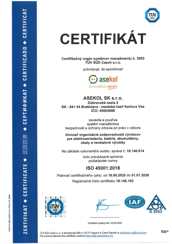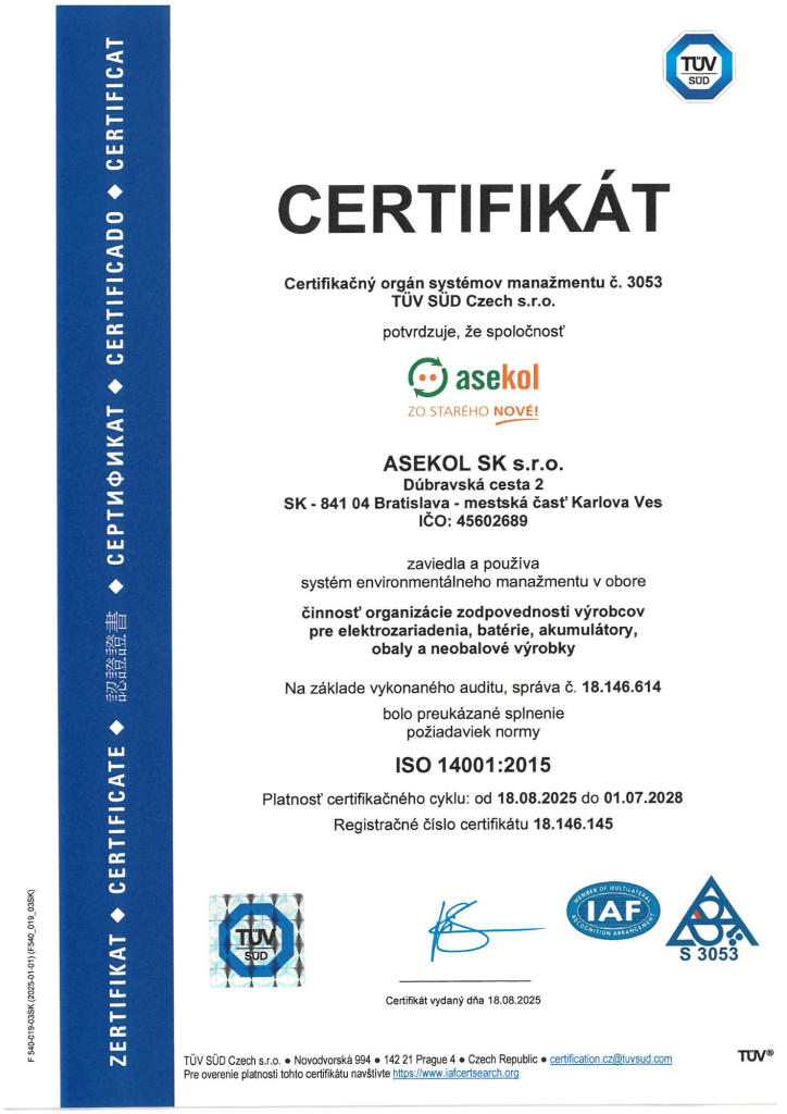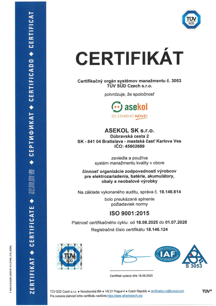 V spoločnosti ASEKOL SK s.r.o. máme zavedený certifikovaný integrovaný systém riadenia, ktorý spája požiadavky jednotlivých noriem: